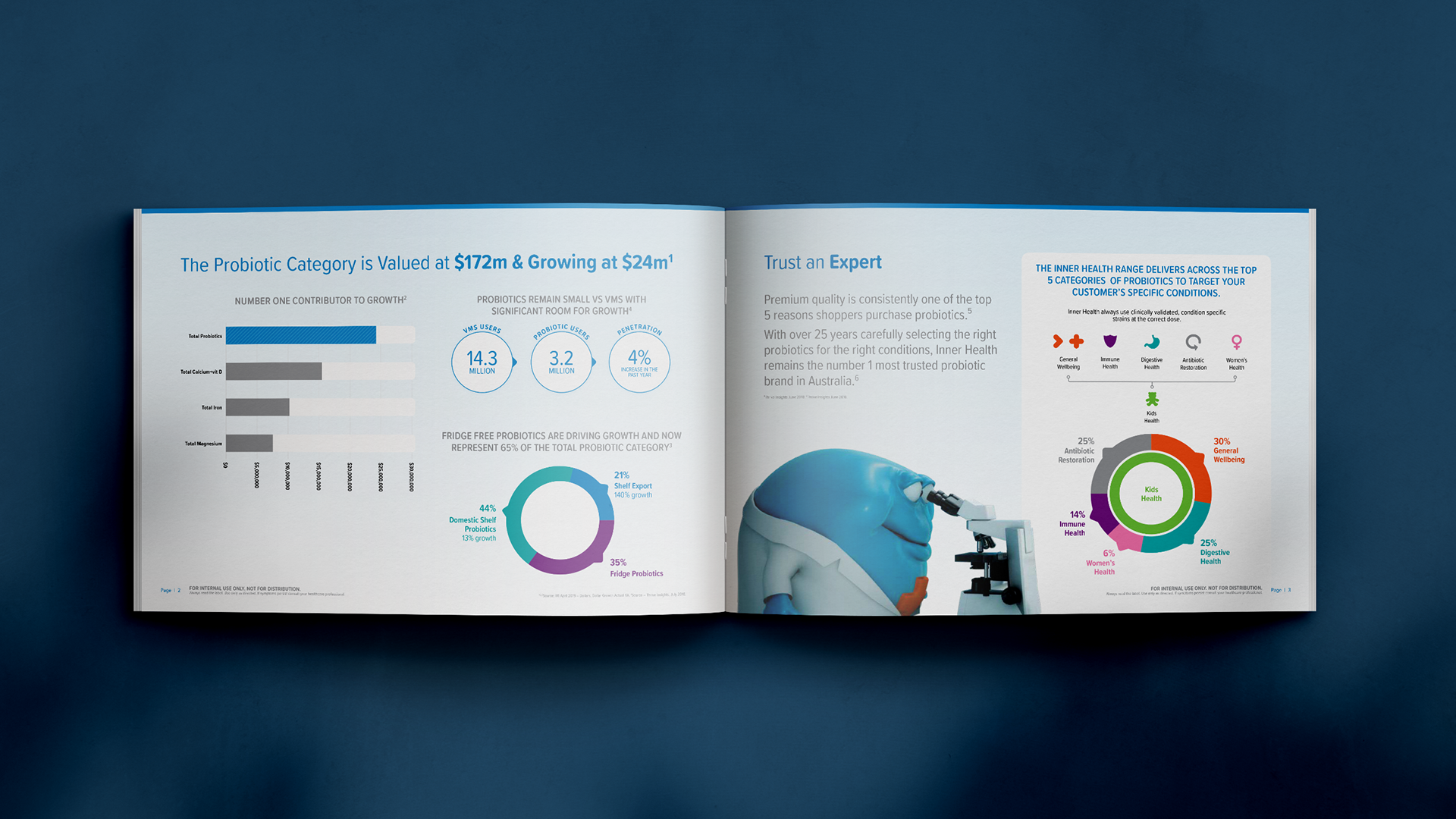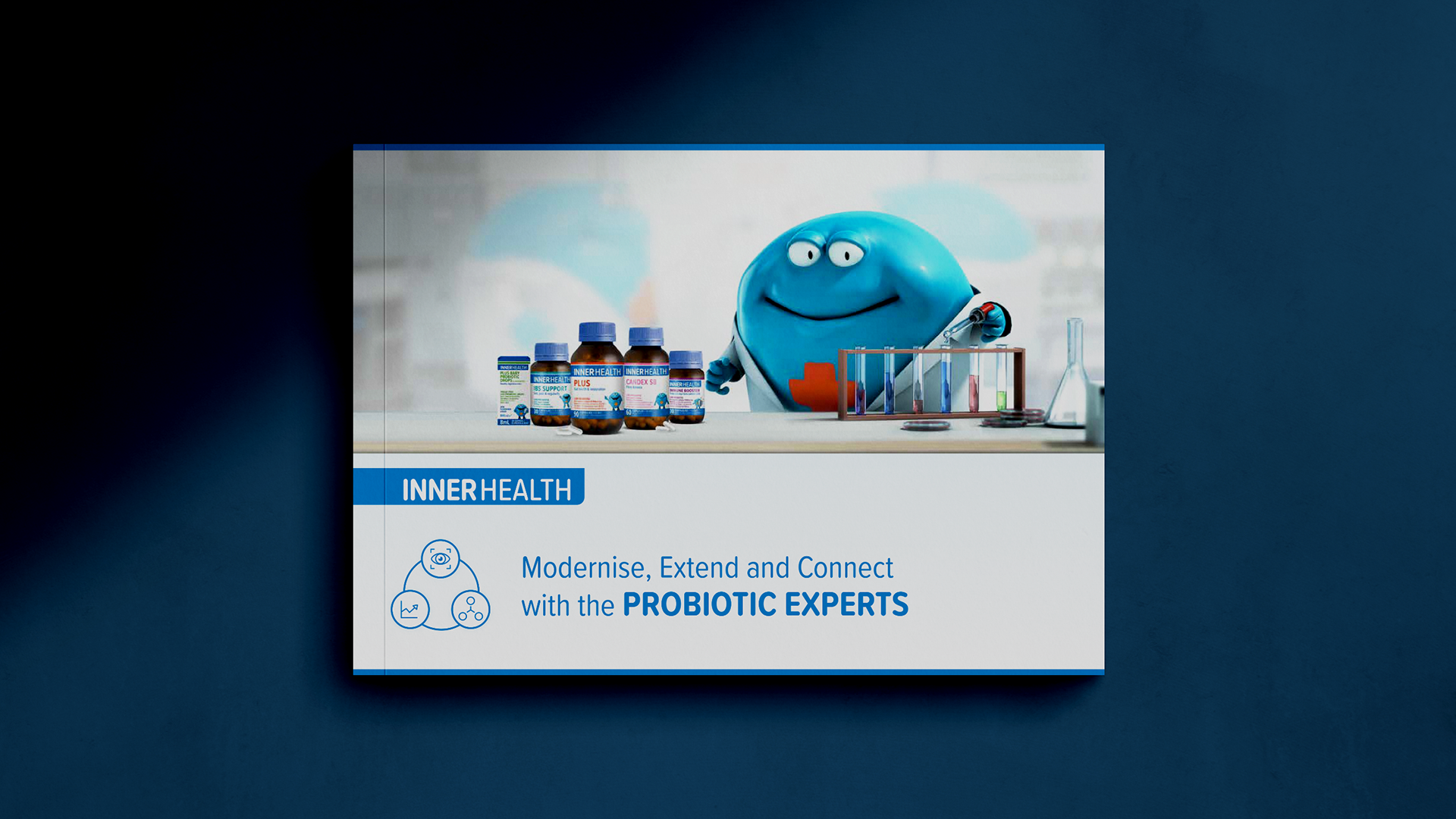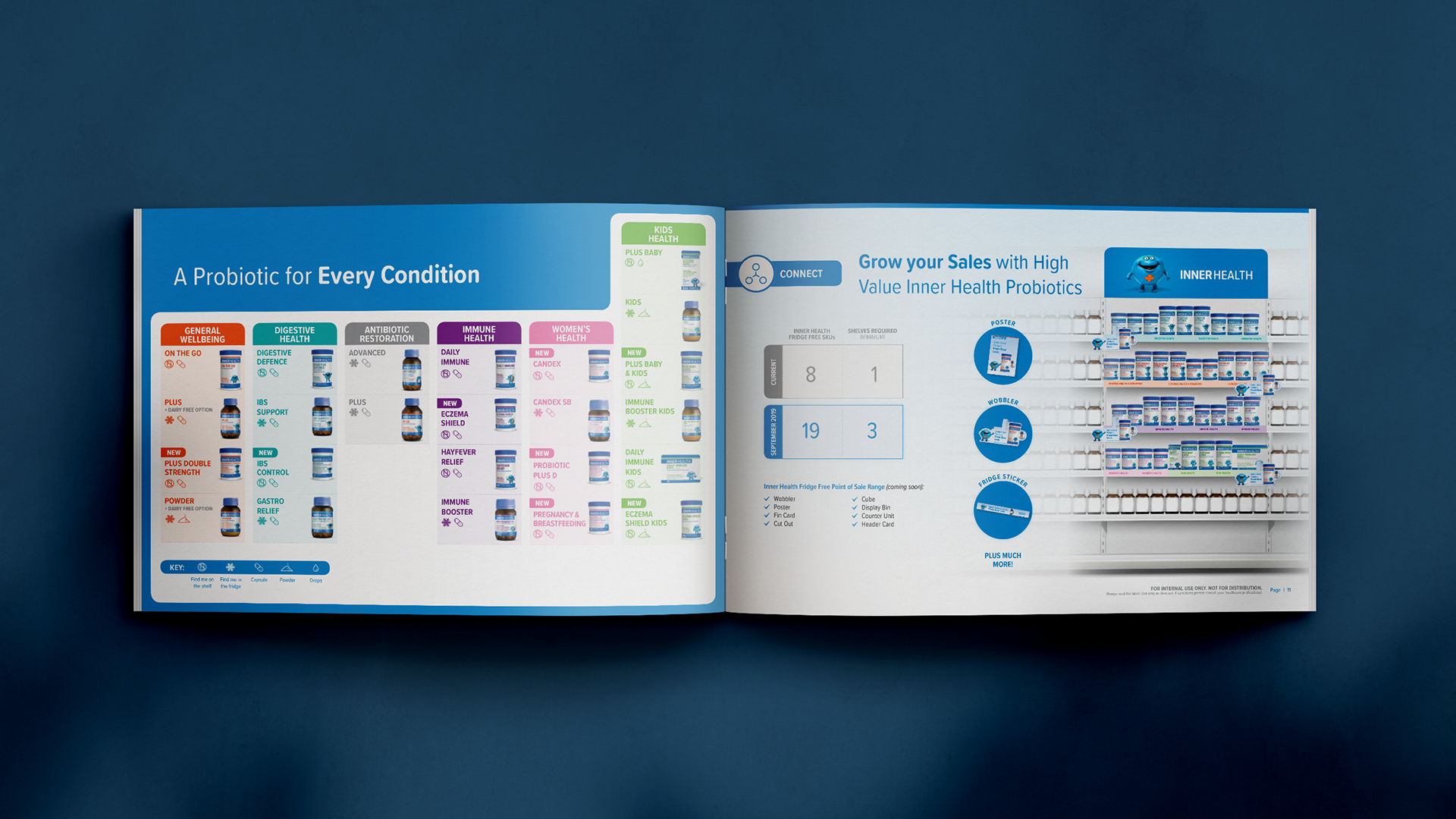 Following Inner Health’s rebrand, I designed a pharmacy trade presenter from scratch—an internal-facing sales brochure used to pitch the range into pharmacy. The document combines category insights, product innovation storytelling (packaging/technology), a range overview, and in-store activation/campaign timing, supported by bespoke infographics and structured information hierarchy