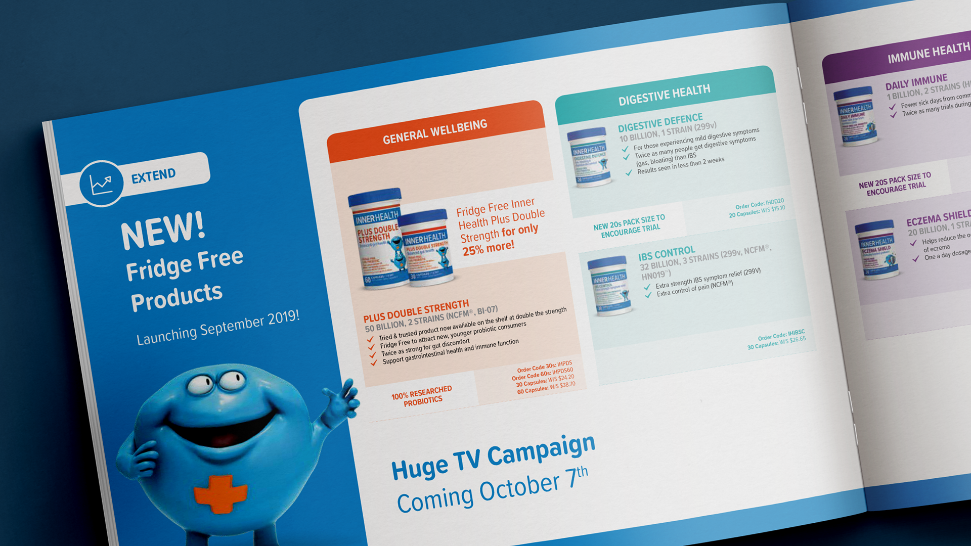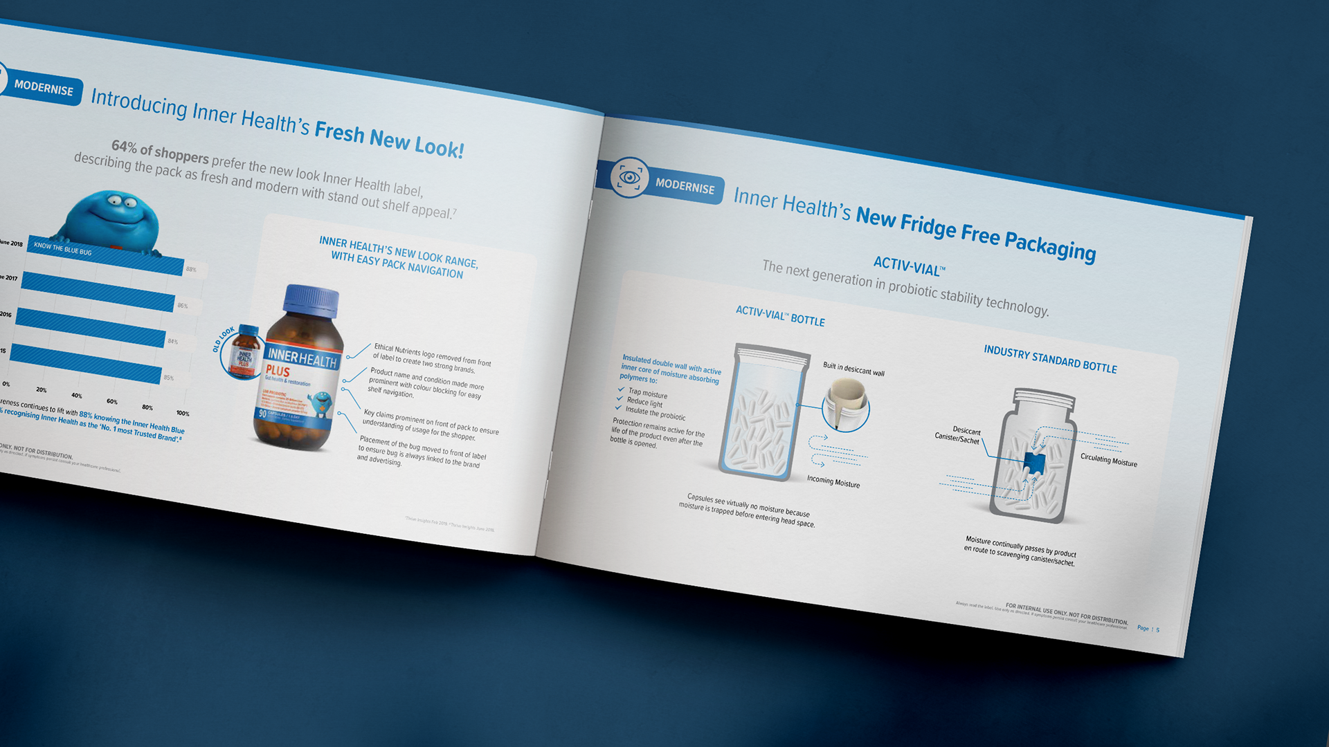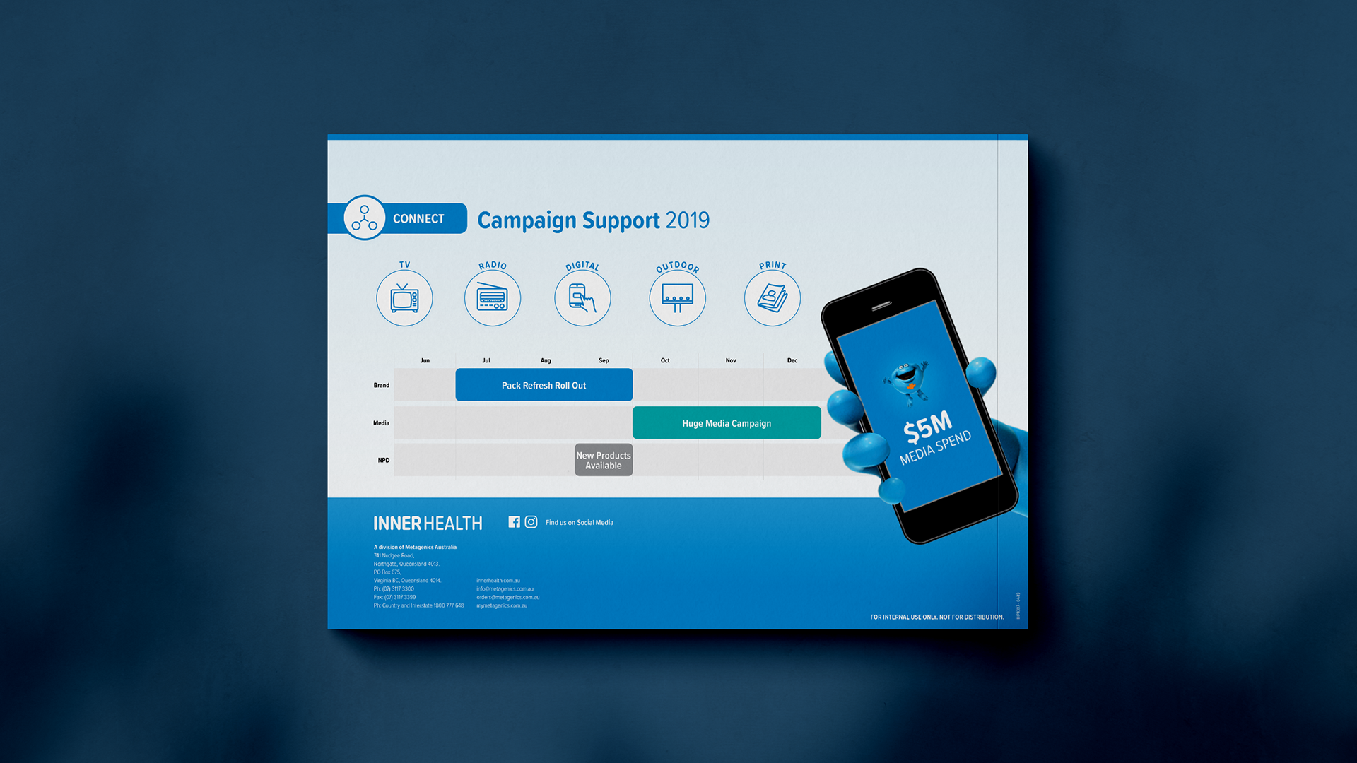 Following Inner Health’s rebrand, I designed a pharmacy trade presenter from scratch—an internal-facing sales brochure used to pitch the range into pharmacy. The document combines category insights, product innovation storytelling (packaging/technology), a range overview, and in-store activation/campaign timing, supported by bespoke infographics and structured information hierarchy