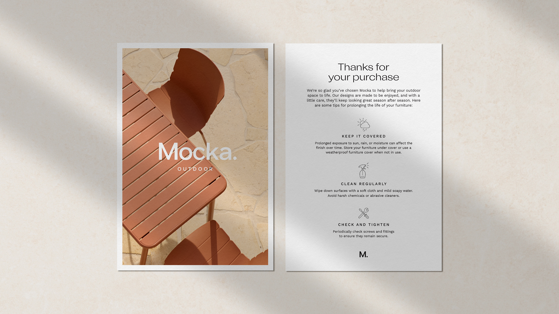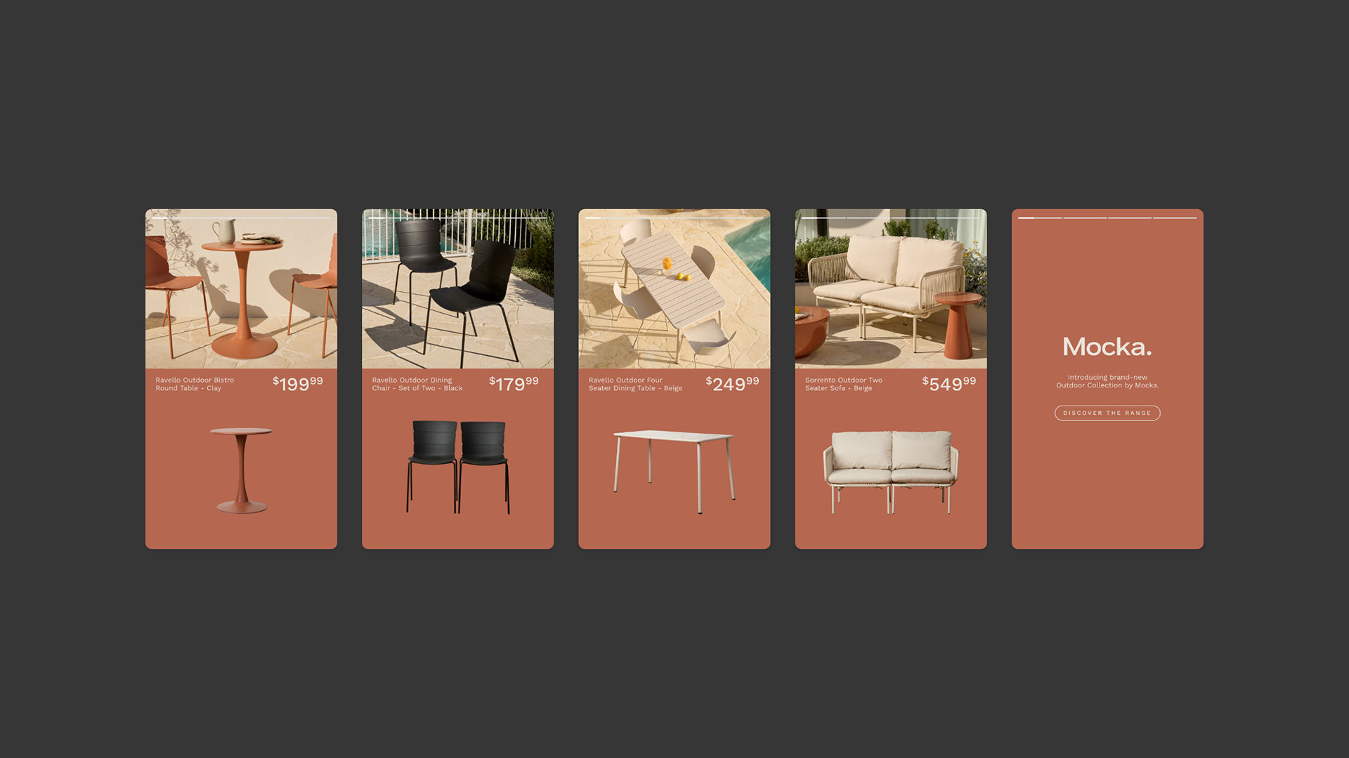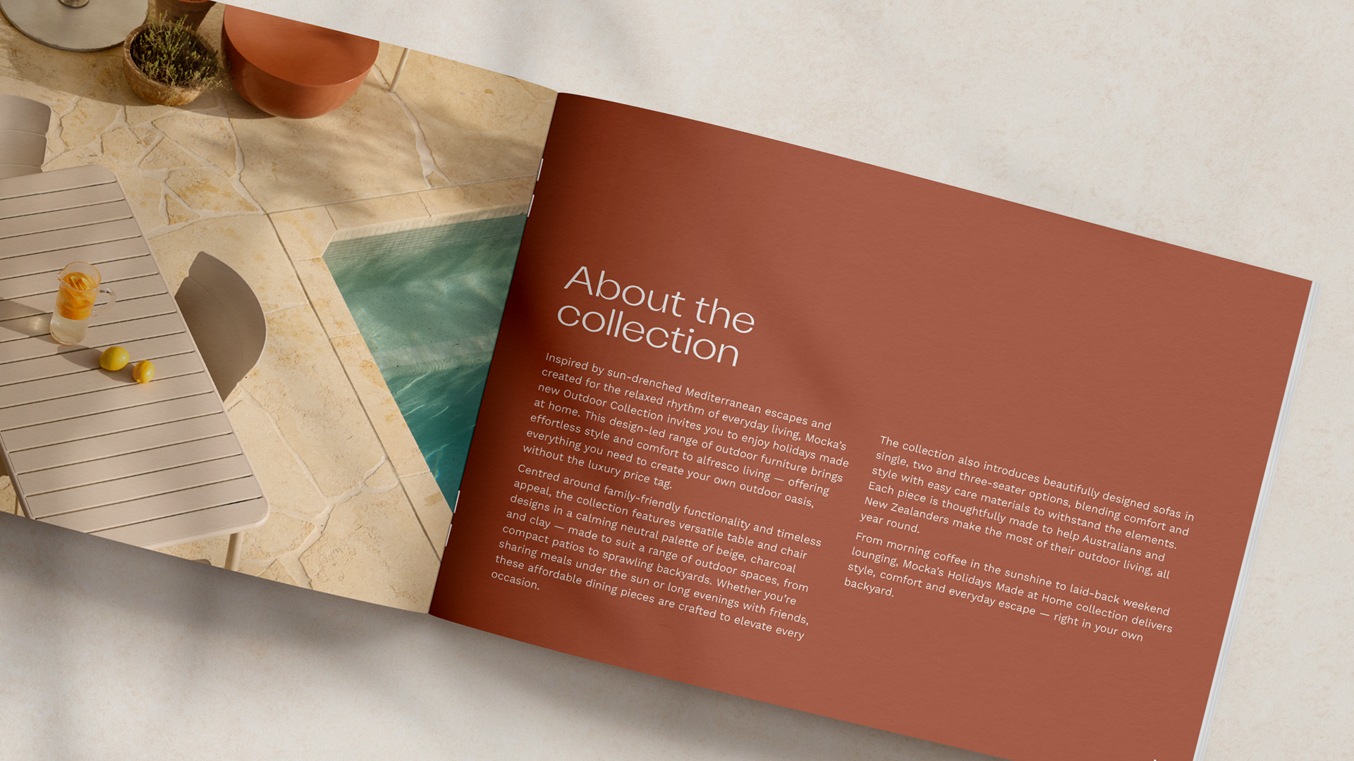 For Mocka’s Outdoor Furniture launch, I designed a consistent set of visuals across the website landing page, paid ads, and print. I created layouts and a flexible set of ad graphics (both static and motion) that carried the “Holidays Made at Home” message across Meta and YouTube, while keeping the look clean, clear, and easy to shop. The creative used a warm, neutral colour palette to reflect the range and help everything feel connected across channels.